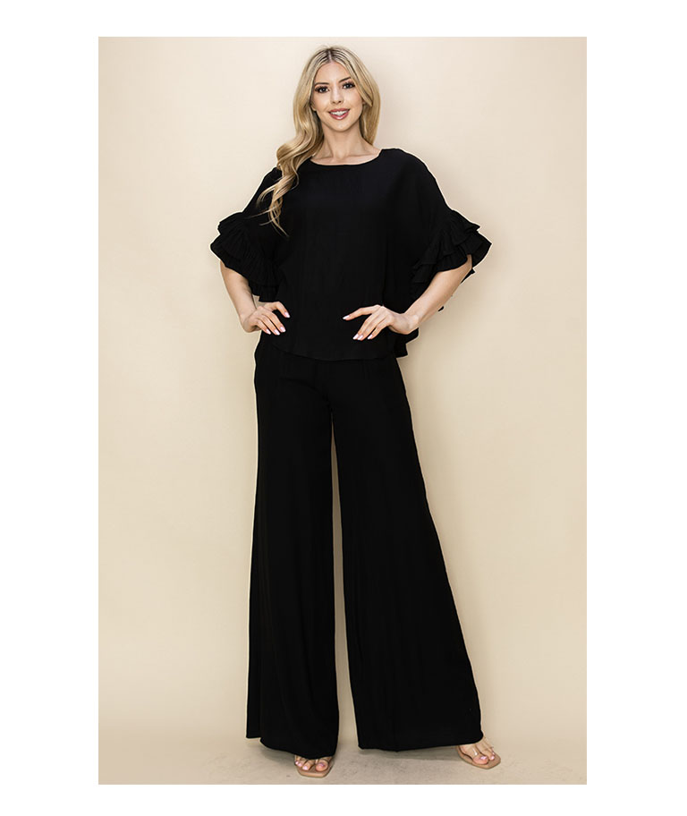 Linen Blouse and Pant set, Linen ruffled sleeve with boat neck as well as zip up closure on the back of blouse, Wide fit bottoms with pockets, Elastic waistband.