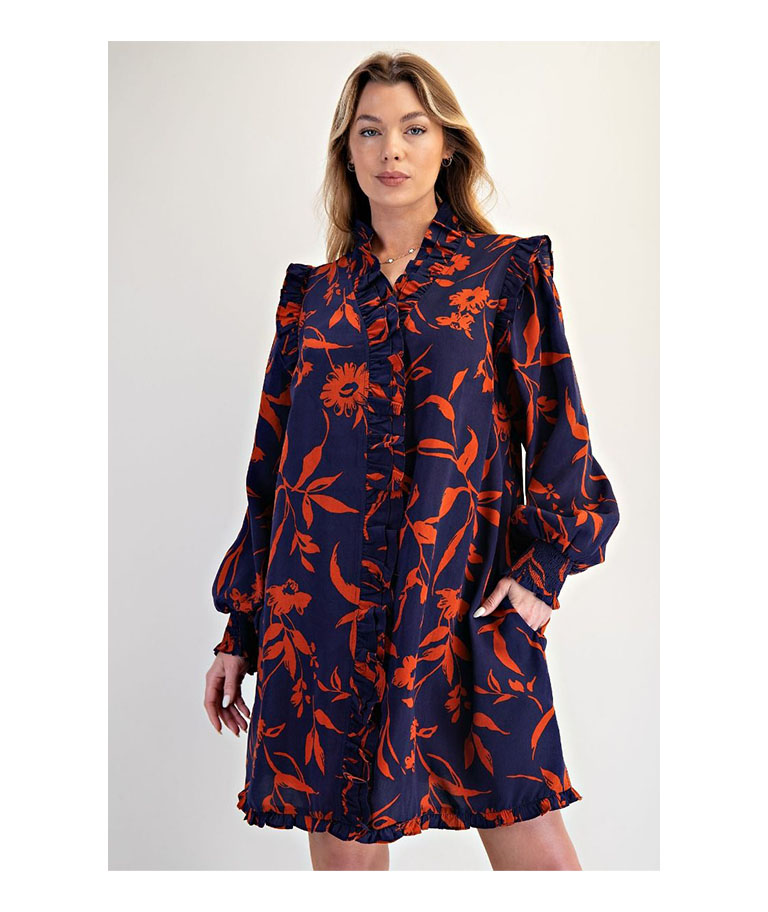 Floral Print Dress: A-line Mini Dress, Ruffled High Neck, Puff Sleeves With Elastic Cuffs, Relaxed & Loose Fitting