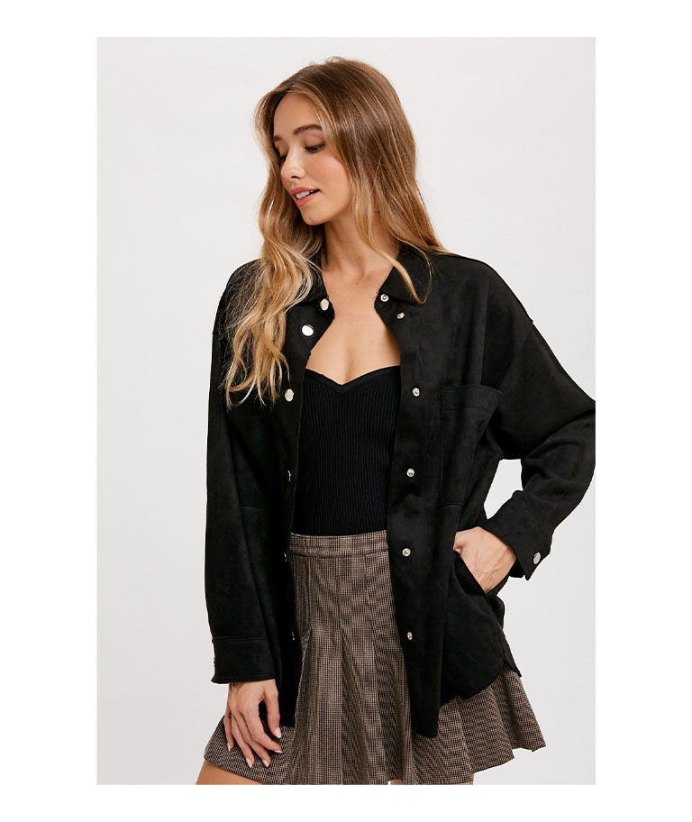 Faux suede shacket features a basic collar, button-down front, two chest pockets & side pocket. Wear it alone or layer over your favorite top as a cute jacket.